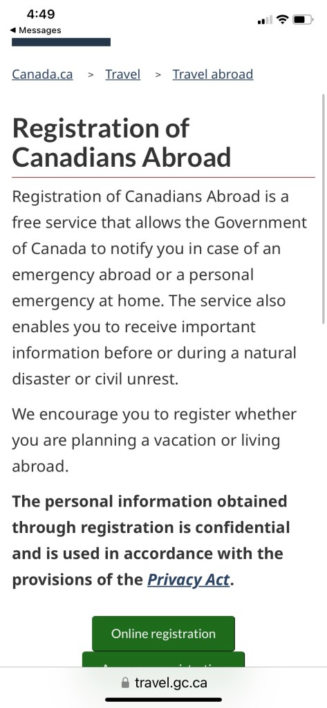 If you’re planning on traveling outside of Canada, it’s a good idea to register your trip with the Canadian government through their online service, found at https://travel.gc.ca/travelling/registration.