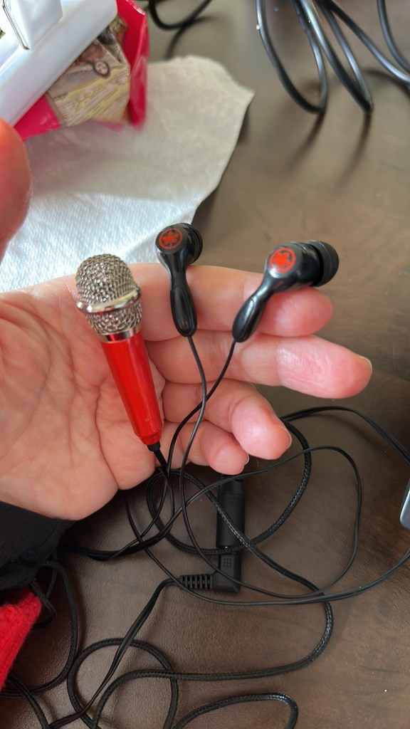 Who says you need expensive equipment? Recently I was in a pinch and all I had was a tiny microphone and the headphones from my last flight.